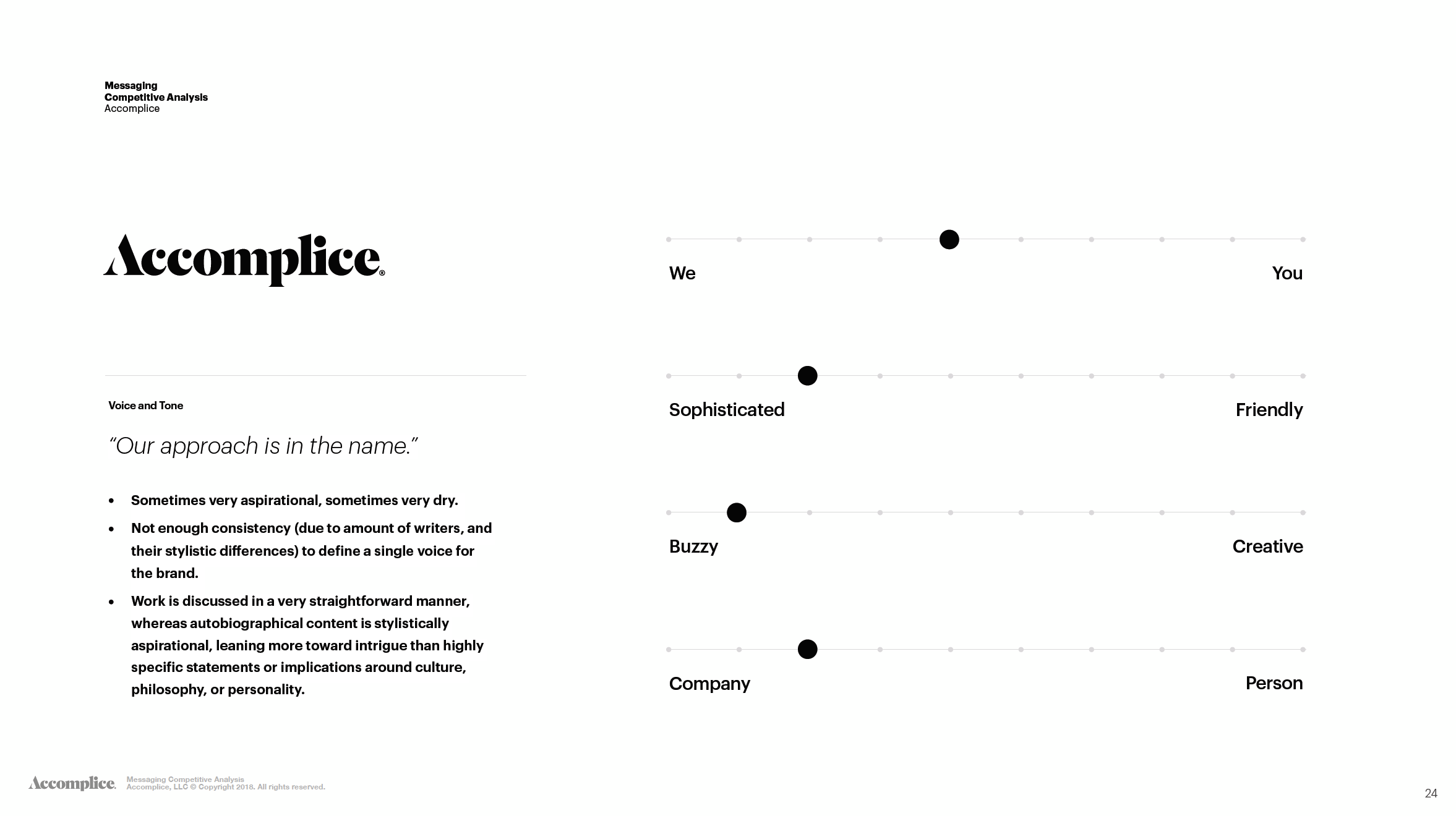 Deliverables: Accomplice brand language and dialect guidelines, and messaging competitive analysis. Delivered Q1 2019.