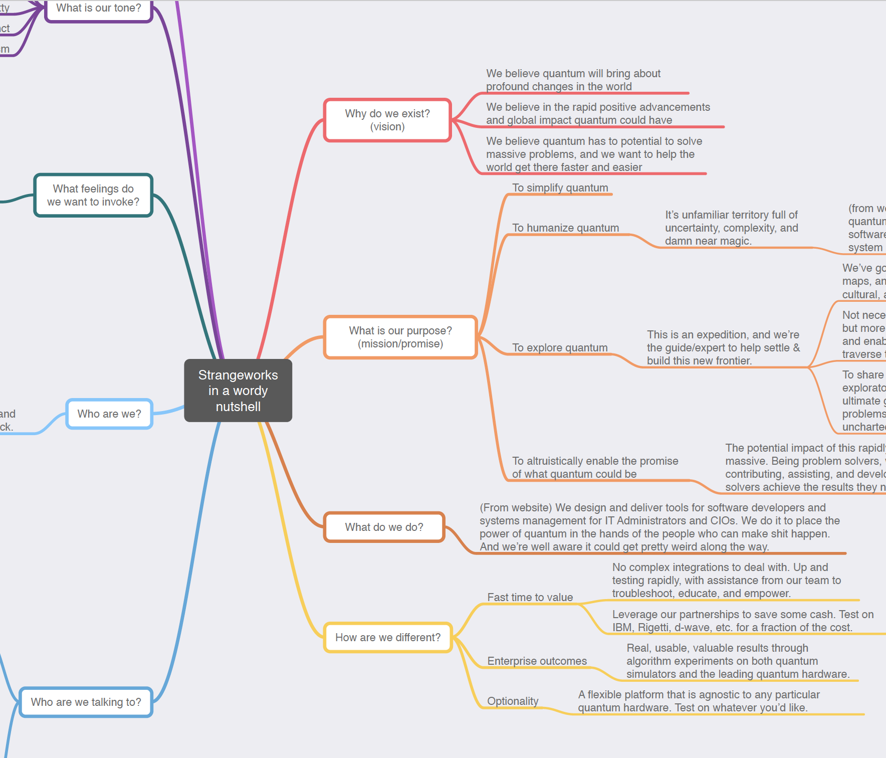 Distilling the personality and flair of the Strangeworks team began with an exercise in mind mapping the outer bounds of what the team aspired to be. To generate the tone of voice we’d use to define Strangeworks moving forward, I worked with the founding team to outline how the brand would (and could) express itself. This map would continuously evolve over time, ultimately assisting lead brand designer Casey Barthels in developing a visual language for Strangeworks’s product.