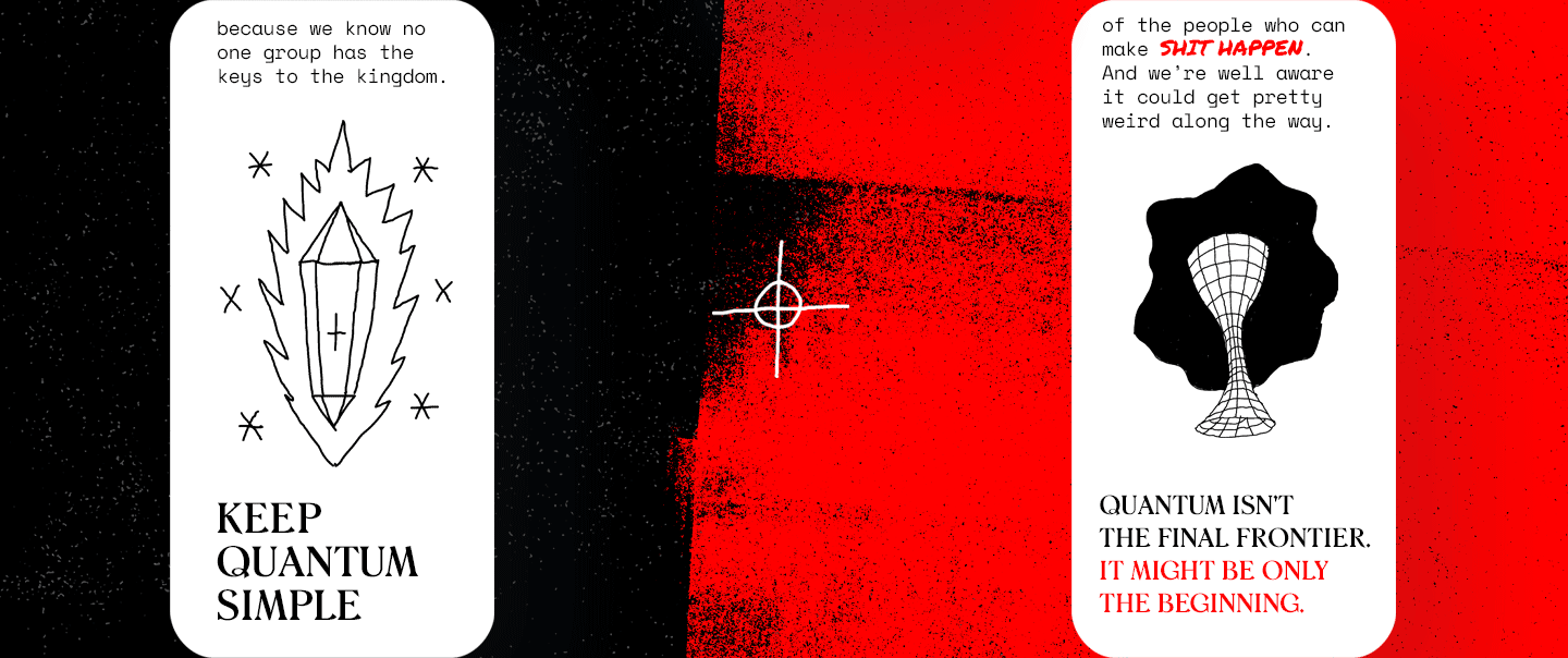 I crafted a manifesto to imbue the Strangeworks brand with a set of values to carry forward Strangeworks’ goal of humanizing quantum simply, curiously, and in a way designed to engage skeptics and new quantum enthusiasts from all walks of life. With a nod to the arcane, mythic look and feel of the Strangeworks brand, I opted to do this through a tarot-style distribution of seven brand tenets. This would guide the Strangeworks narrative toward a quantum future moving forward, and flavored the tone of whurley’s SXSW keynote, too.
